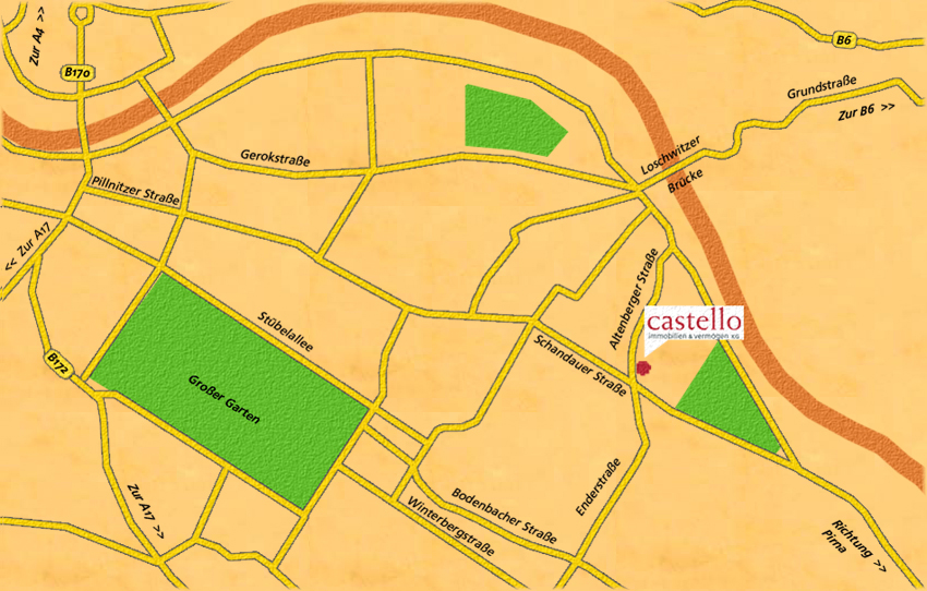Biegen Sie auf die St. Petersburger Straße ein. Am Rathenauplatz (Synagoge) biegen Sie ein die Pillnitzer Straße ein. Folgen Sie dem Straßenverlauf, der in Striesener Straße, Borsbergstraße und schließlich in Schaundauer Straße übergeht. Biegen Sie dann links in die Altenberger Straße ein.